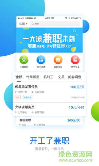 開(kāi)工了app是一款轉(zhuǎn)為大學(xué)生打造的打工服務(wù)軟件,各類(lèi)兼職應(yīng)有盡有,合理的規(guī)劃你的空閑時(shí)間,讓你能夠更加輕松的獲取更多的收益,需要的用戶快來(lái)綠色資源網(wǎng)下載吧!