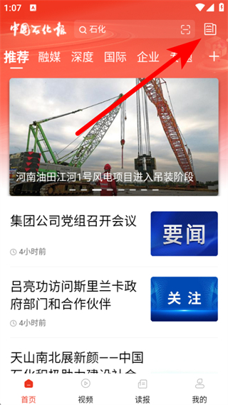 1、打開(kāi)石化新聞app,在首頁(yè)點(diǎn)擊右上角讀報(bào)圖標(biāo),進(jìn)入報(bào)紙閱讀頁(yè)面。