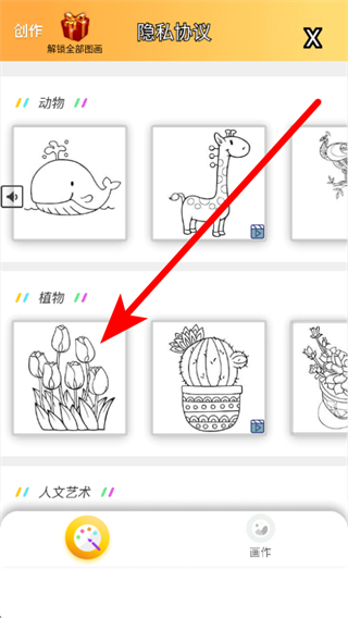 1、打開小豬畫畫涂色APP,選擇喜歡的涂色圖案如植物類的郁金香圖案,進入涂色界面。