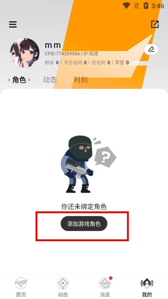 2、在個人界面中若顯示你還未綁定角色,點(diǎn)擊下方添加游戲角色按鈕。