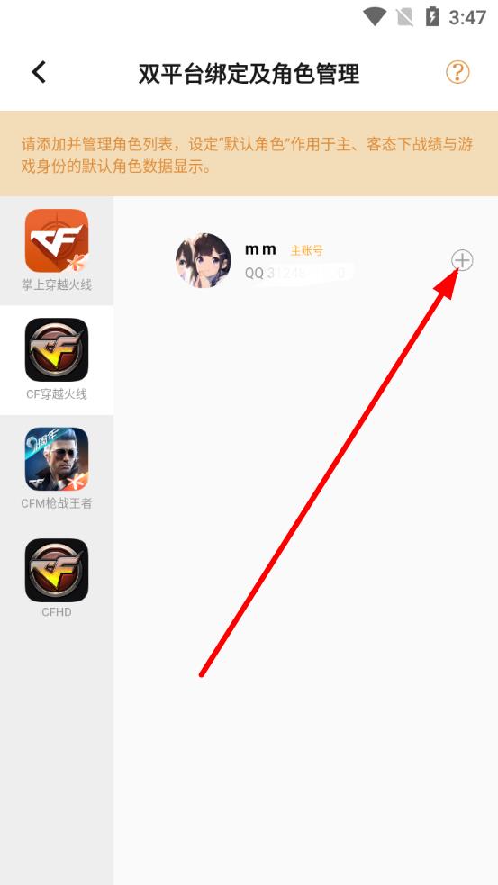 3、進(jìn)入雙平臺綁定及角色管理界面,點(diǎn)擊主賬號右側(cè)的+號。