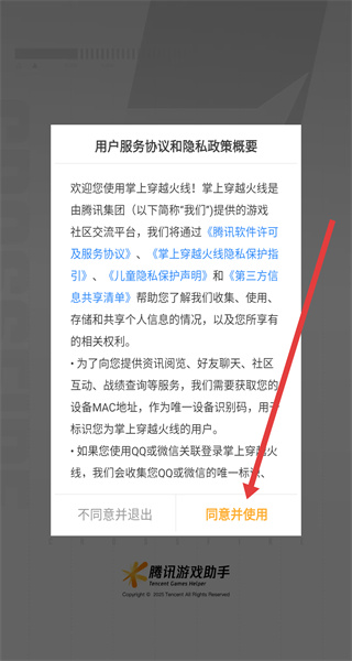 1、打開掌上穿越火線APP,彈出用戶服務(wù)協(xié)議和隱私政策摘要窗口,點(diǎn)擊同意并使用。