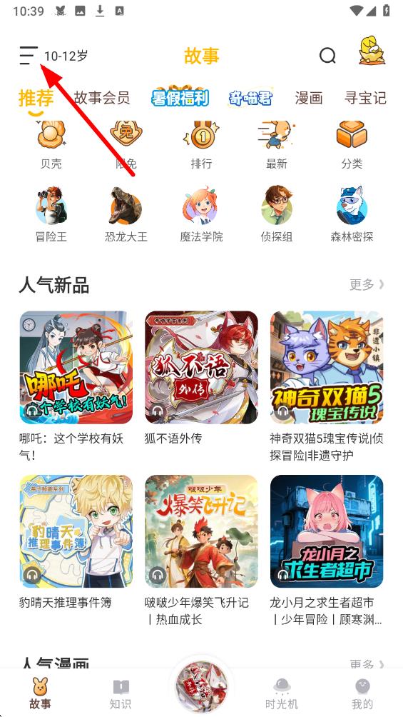 1、打開口袋故事聽聽APP,點擊主界面左上角的三橫線菜單圖標(biāo),調(diào)出側(cè)邊菜單欄。