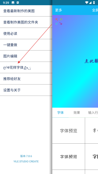 2、在展開的功能菜單中,點(diǎn)擊花樣字體選項(xiàng),進(jìn)入字體選擇界面。