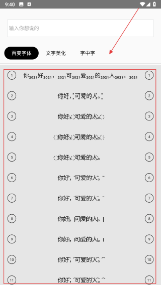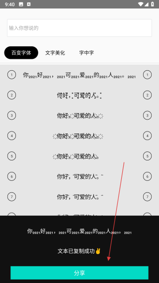 4、選好字體樣式后,文本會自動復(fù)制,可點(diǎn)擊分享按鈕將美化后的文字分享。