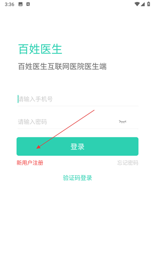 1、打開百姓醫(yī)生互聯(lián)網(wǎng)醫(yī)院醫(yī)生端app,在登錄頁面點擊新用戶注冊選項。