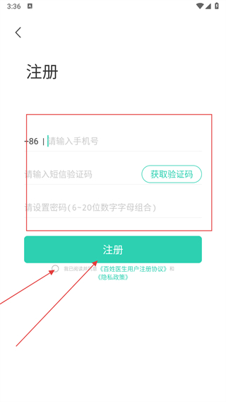 2、在注冊頁面,輸入手機號、驗證碼,設置密碼,勾選同意協(xié)議和隱私政策,點擊注冊。