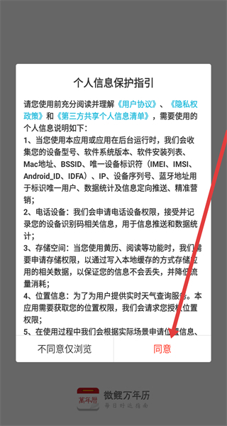 1、在“個人信息保護指引”彈窗點擊“同意”,進入微鯉萬年歷主界面。