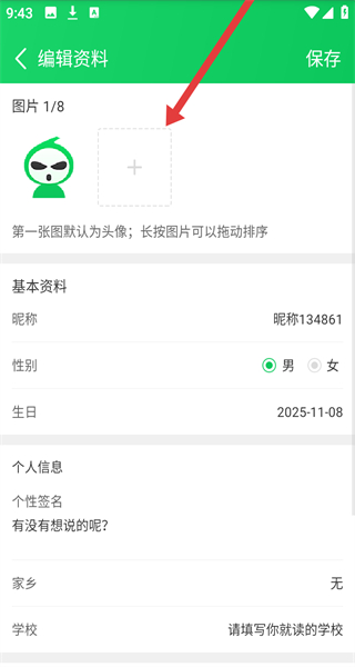4、可以通過點(diǎn)擊+號區(qū)域,進(jìn)行添加圖片作為頭像修改,添加后點(diǎn)擊右上角保存按鈕,即可完成操作。