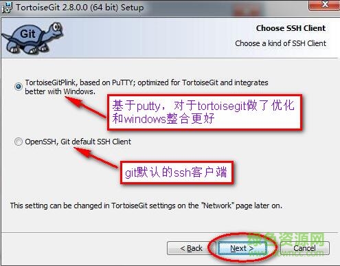 5.這里選openssh(git默認的shh客戶端,位于git安裝目錄/bin/ssh.exe;如果配置了path,那直接是ssh.exe)和tortoisegitplink(位于tortoisegit安裝目錄/bin下)都可以,我們這里默認第一個,繼續(xù)“next”