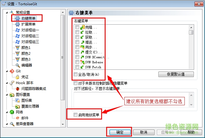 4.上面操作完成后,我們再次鼠標右鍵,可以看到菜單已經(jīng)變成中文了,“settings”變成了“設(shè)置”,“slone”變成了“克隆”;再次打開配置菜單,選擇“右鍵菜單”,去掉所有的勾選(如圖),點擊“確定”