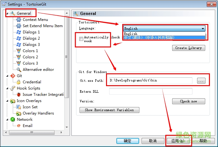3.點擊左邊側(cè)欄中的“general”,在右邊的“l(fā)anguage”中選擇“中文(簡體)”,并去掉“automatically check week”前面的勾;點擊“git.exe path”指定git.exe文件的路徑,如“d:\devlopprograms\git\bin”,設(shè)置完成后,點擊“應(yīng)用”。