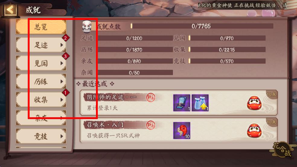 2、在成就界面,通過(guò)左側(cè)分類(lèi)欄可查看總覽、足跡、見(jiàn)聞等不同分類(lèi)的成就內(nèi)容。