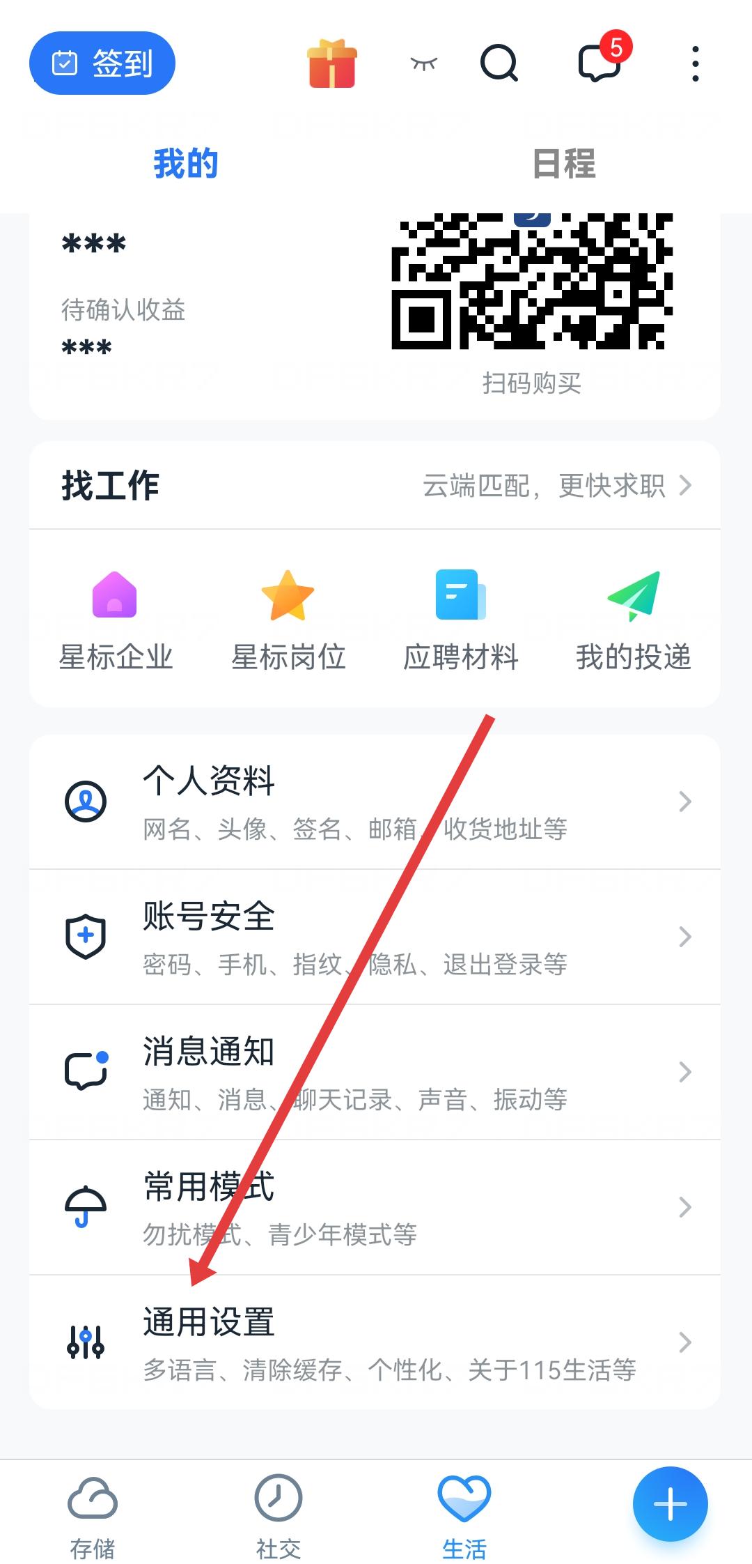 1、打開(kāi)115生活A(yù)PP,進(jìn)入我的頁(yè)面,點(diǎn)擊通用設(shè)置選項(xiàng),進(jìn)入通用設(shè)置界面。
