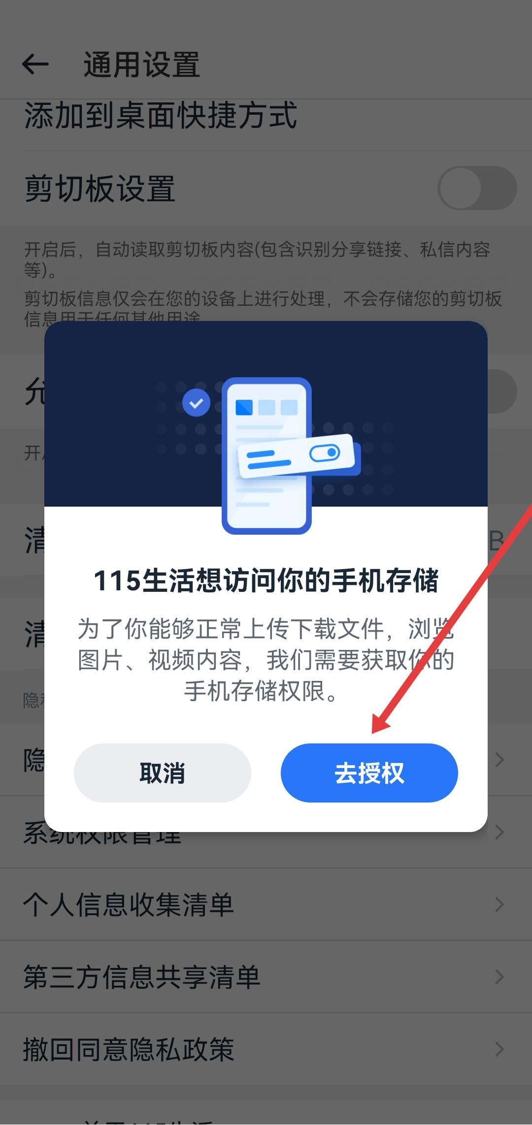 3、在115生活想訪問(wèn)你的手機(jī)存儲(chǔ)彈窗中,點(diǎn)擊去授權(quán)按鈕,為APP開(kāi)啟存儲(chǔ)訪問(wèn)權(quán)限。
