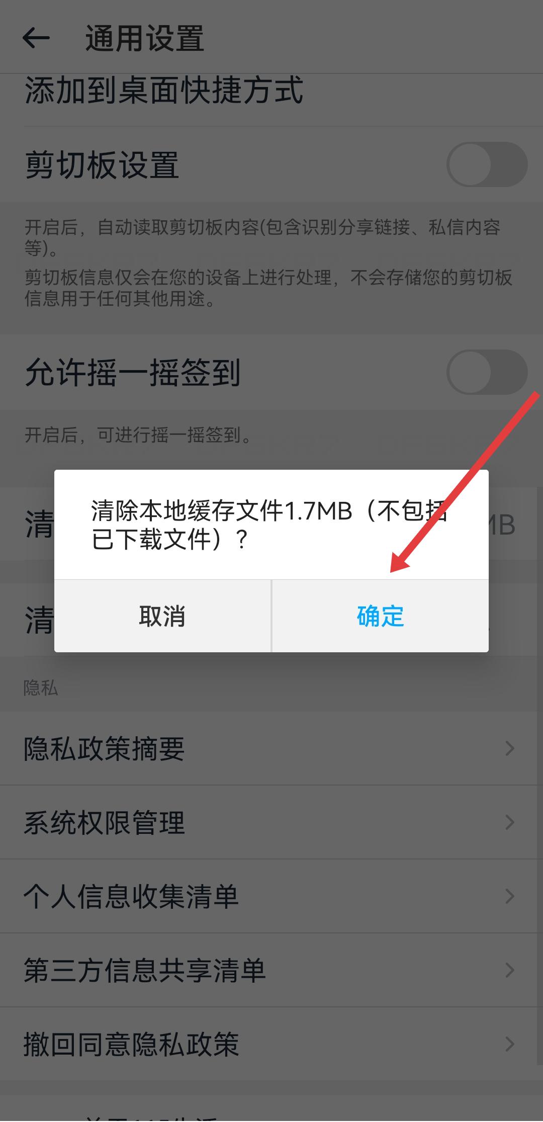 4、在清除本地緩存文件1.7MB的確認(rèn)彈窗中,點(diǎn)擊確定按鈕,完成緩存清理。