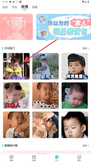 2、在表情的頁面中,可在今日熱門中進行選擇,也可通過排行榜進行查看。