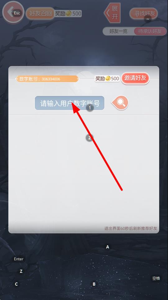 3、在彈出的添加好友界面中,在請輸入用戶數(shù)字賬號輸入框里,輸入你想添加好友的數(shù)字賬號,然后點(diǎn)擊旁邊的搜索按鈕,找到對應(yīng)好友后發(fā)送添加申請即可。