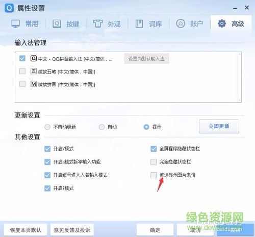 1.從輸入法設置里面進去,左鍵點擊手板圖標,選擇高級選項卡,進入到里面去掉圖片表情的勾,點擊確定