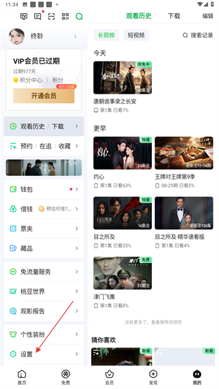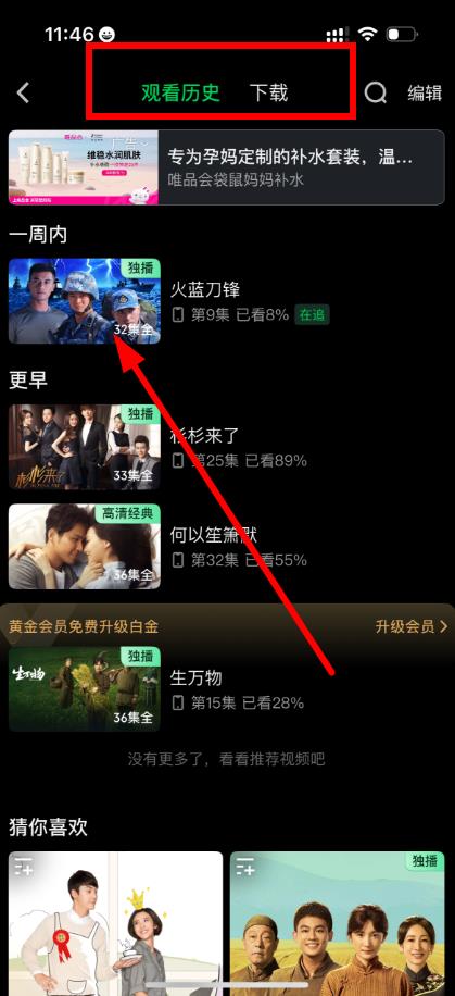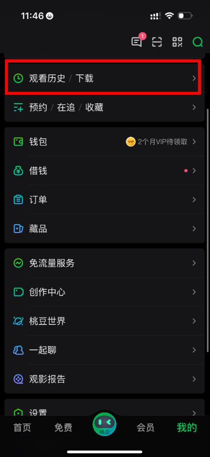 2、在個(gè)人界面中,找到并點(diǎn)擊觀看歷史/下載選項(xiàng)進(jìn)入觀看歷史頁(yè)面。