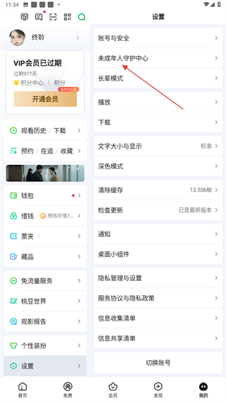 3、在左側(cè)呈現(xiàn)設(shè)置的頁(yè)面,點(diǎn)擊未成年人守護(hù)中心。
