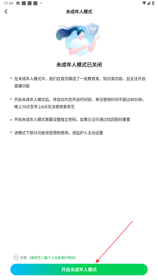 5、了解該模式后,點(diǎn)擊下方開(kāi)啟未成年人模式即可。