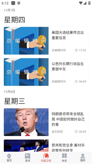 4、手機(jī)上就可以看到鳳凰衛(wèi)視的節(jié)目,每天的節(jié)目都匯聚在這里,各個(gè)時(shí)期的新聞讓你隨時(shí)收聽了解,及時(shí)推送最快的咨詢。