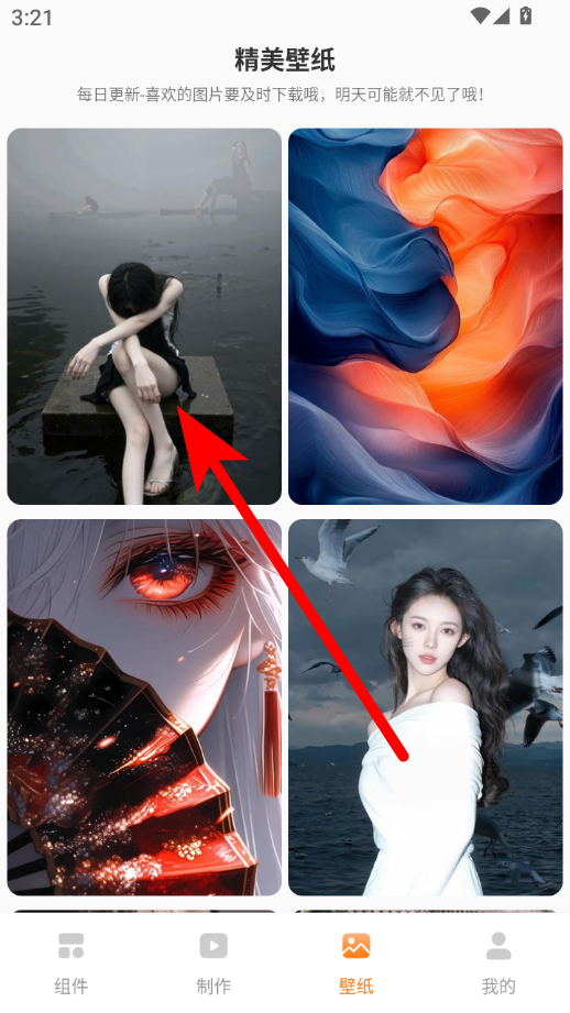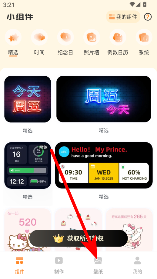 1、在小組件頁面,點(diǎn)擊下方壁紙選項(xiàng),進(jìn)入精美壁紙界面。