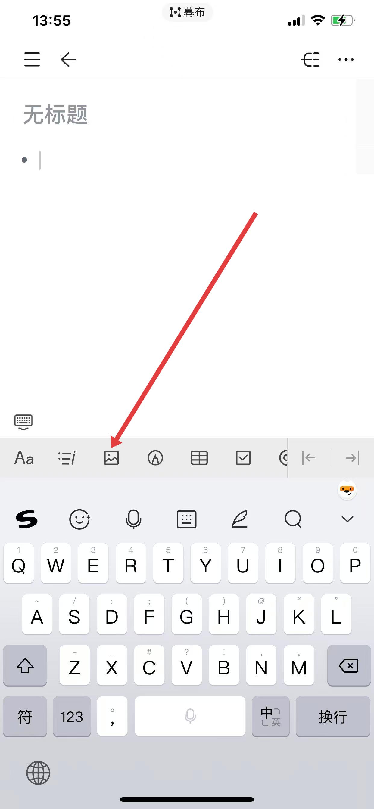 2、進(jìn)入文檔編輯界面,點(diǎn)擊鍵盤(pán)上方功能欄中的圖片圖標(biāo)。