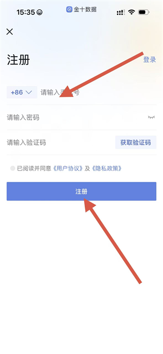 4、在注冊界面,填寫信息,勾選協(xié)議后點(diǎn)擊注冊,完成注冊操作。