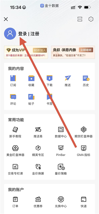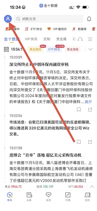 1、在金十?dāng)?shù)據(jù)快訊頁面,點(diǎn)擊左上角個人圖標(biāo),進(jìn)入個人界面。