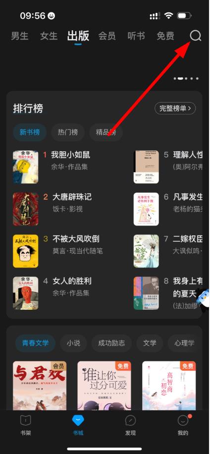 1、打開QQ閱讀APP,進入書城頁面,點擊右上方的放大鏡搜索圖標(biāo)。