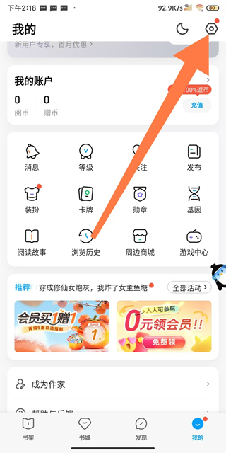 1、在QQ閱讀我的頁面,點擊右上角設(shè)置圖標(biāo),進入設(shè)置頁面。