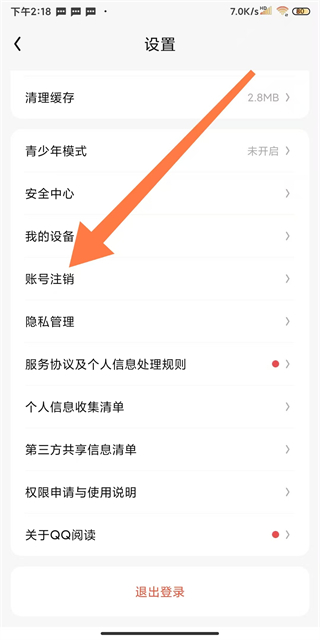 2、在設(shè)置頁面,點擊賬號注銷選項,進入賬號注銷頁面。