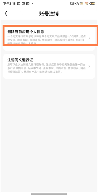 3、在賬號注銷頁面,點擊刪除當(dāng)前應(yīng)用個人信息選項,進入確認(rèn)刪除頁面。