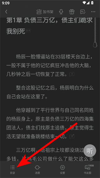 3、在書籍閱讀界面,點擊左下角目錄選項,進入目錄查看界面。