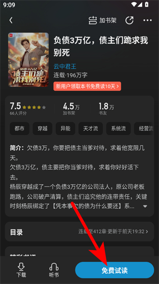 2、在書籍詳情頁面,點擊免費試讀按鈕,進入書籍閱讀界面。