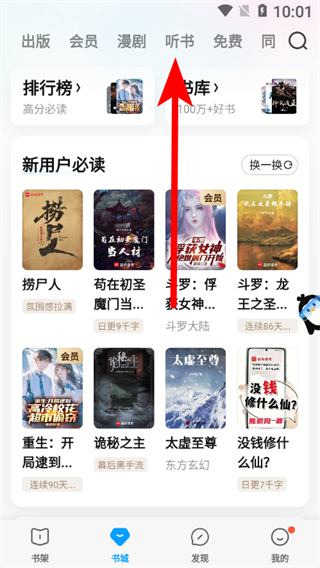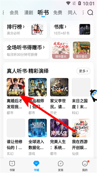 1、在QQ閱讀書城頁面,點擊聽書選項,進入聽書頻道頁面。