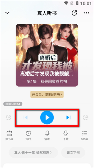 3、在聽書播放界面,可利用播放控制區(qū)域進行播放、暫停、切換章節(jié)等操作,即可聽書。