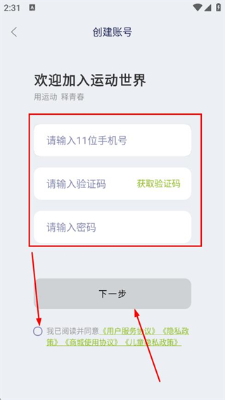 4、填寫手機(jī)號、驗證碼、設(shè)置密碼,勾選協(xié)議,點(diǎn)擊下一步,完成賬號注冊。