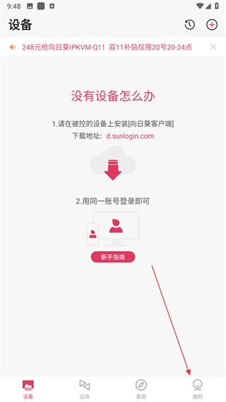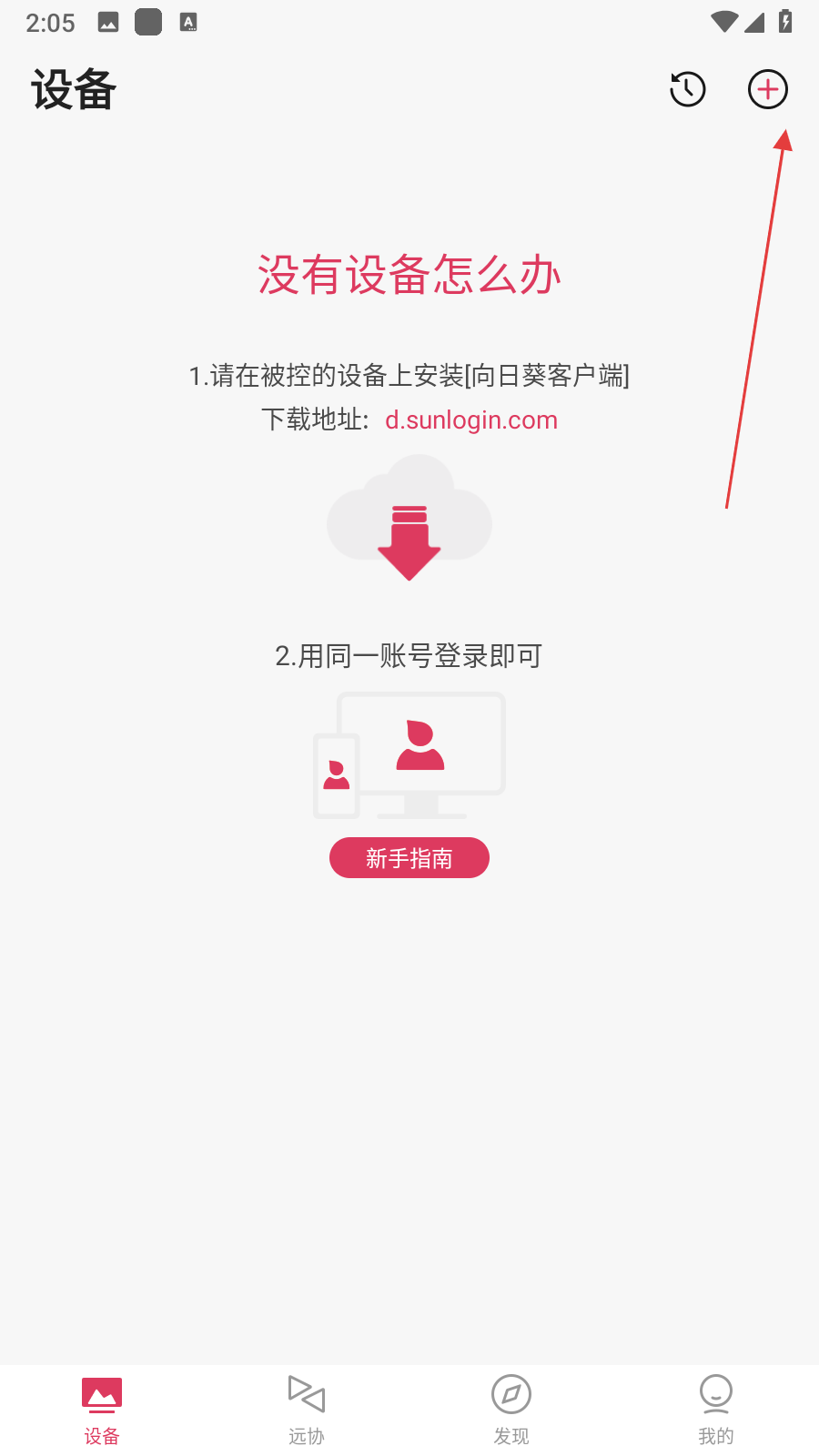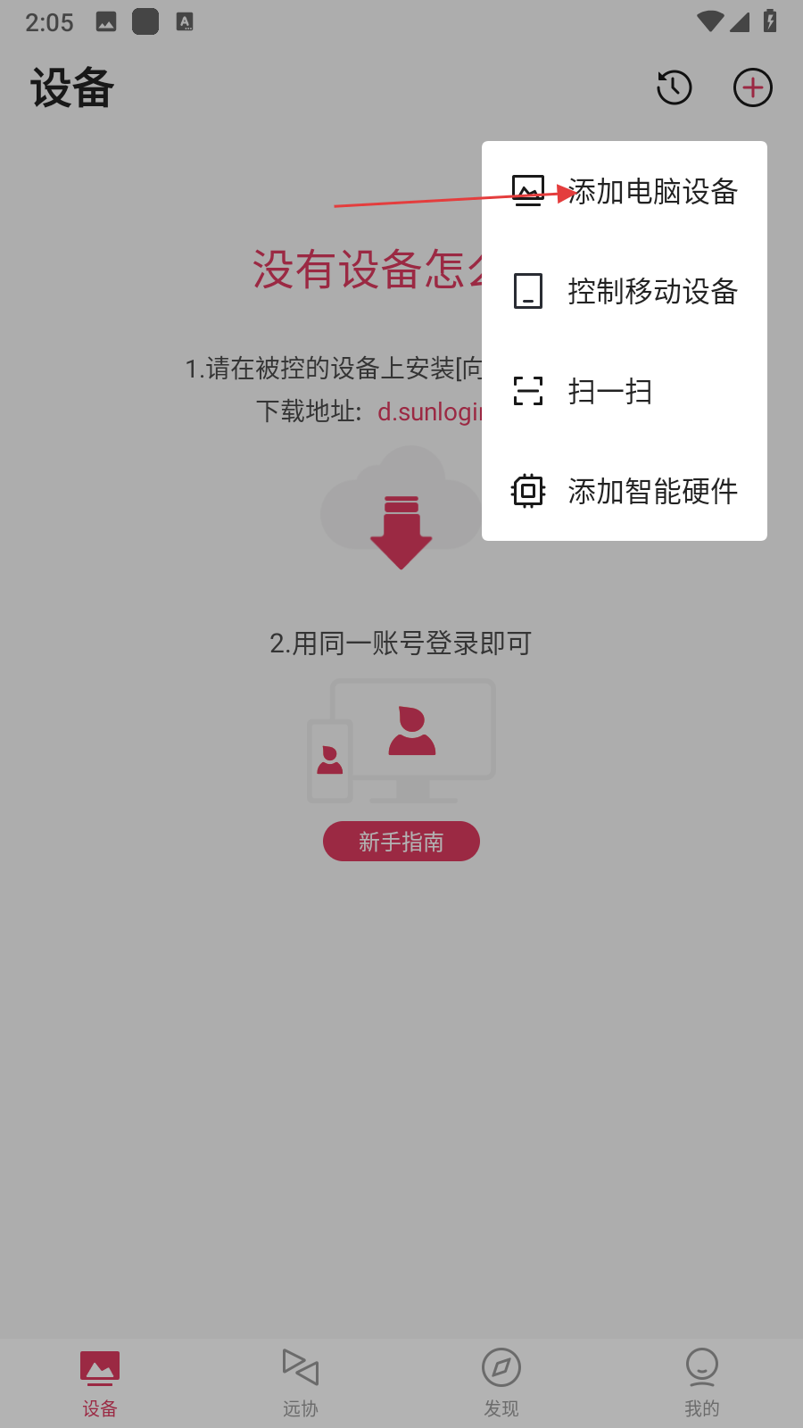 1、打開向日葵遠(yuǎn)程控制App,進(jìn)入主界面后點(diǎn)擊下方設(shè)備選項,在設(shè)備頁面點(diǎn)擊右上角的+號按鈕,打開添加設(shè)備菜單。