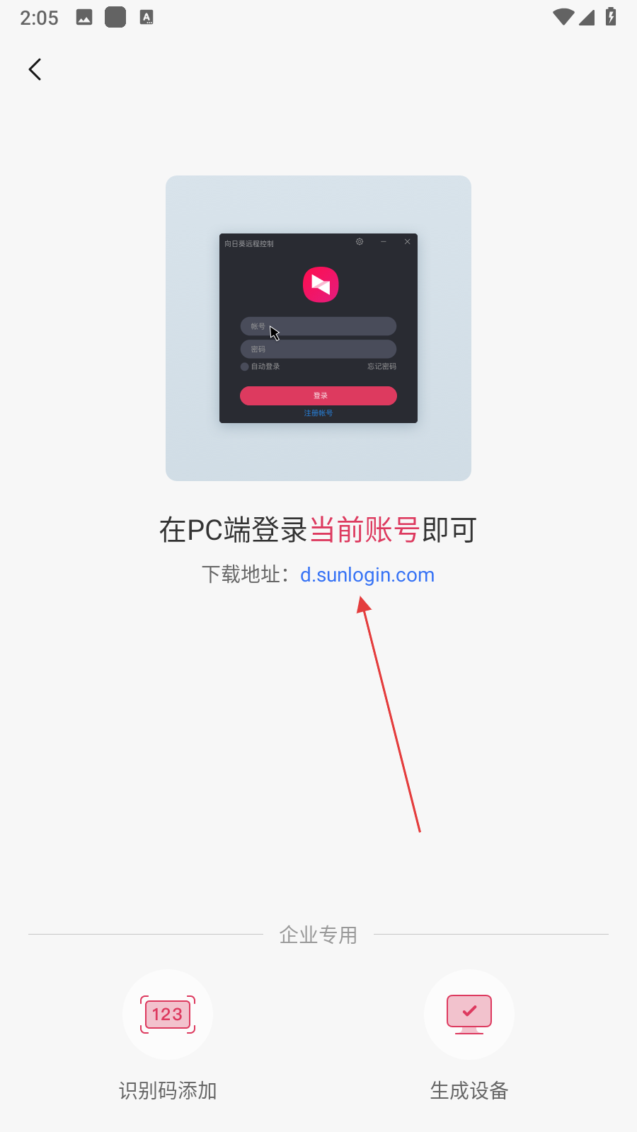 3、若電腦端已安裝向日葵客戶端,確保在電腦端登錄與手機(jī)端相同的賬號,若未安裝,可點(diǎn)擊界面中的下載地址,在電腦上下載安裝客戶端后登錄賬號,即可完成電腦設(shè)備添加。