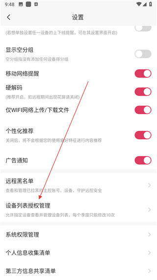 3、在設(shè)置界面中,找到并點(diǎn)擊設(shè)備列表授權(quán)管理選項,進(jìn)入設(shè)備列表授權(quán)管理頁面。