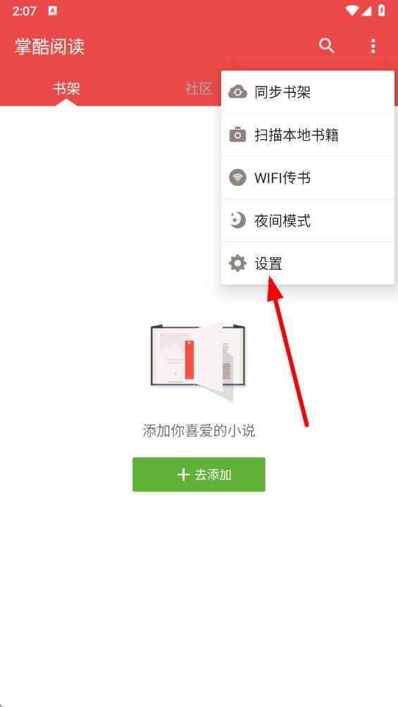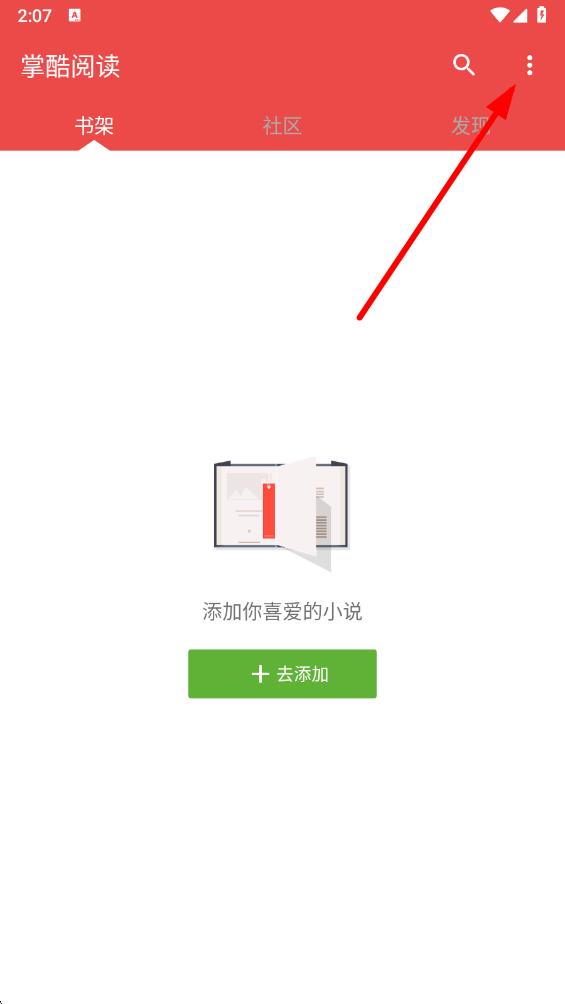 1、打開掌酷閱讀app,在書架界面點擊右上角的菜單按鈕,打開功能菜單。