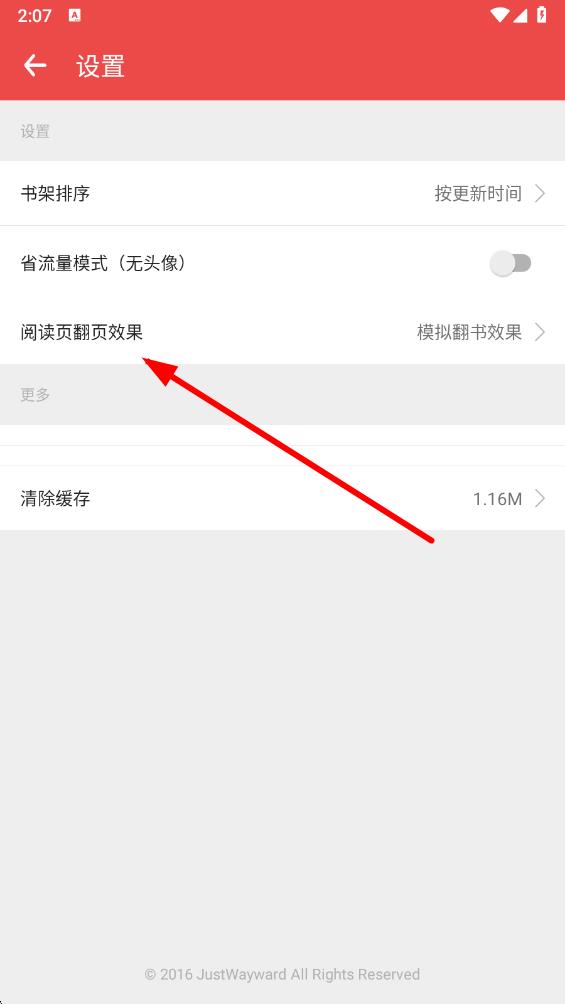 3、在設置頁面里,找到閱讀頁翻頁效果選項并點擊,進入翻頁效果選擇界面。