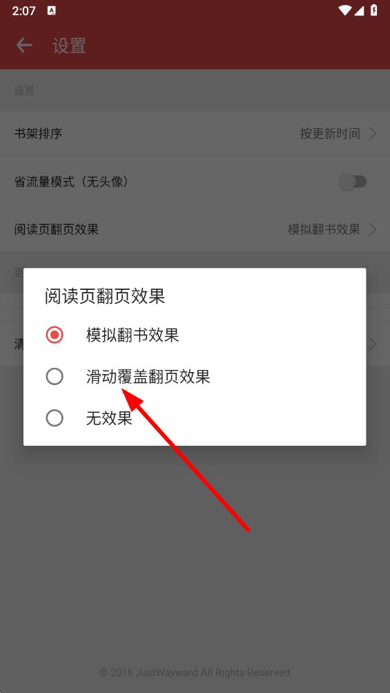 4、在閱讀頁翻頁效果選擇界面中,點擊滑動覆蓋翻頁效果選項,完成滑動翻頁設置。