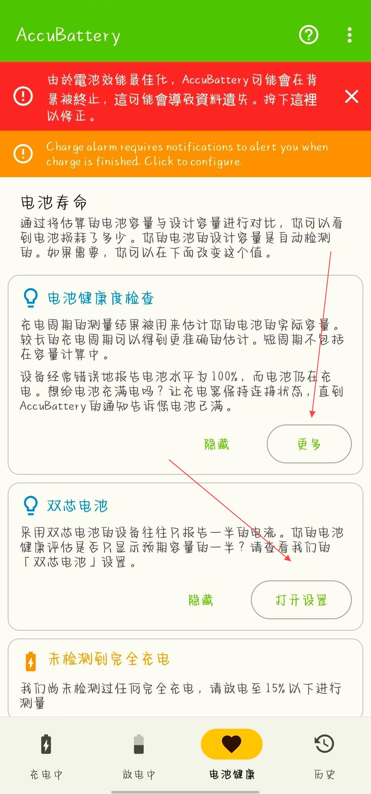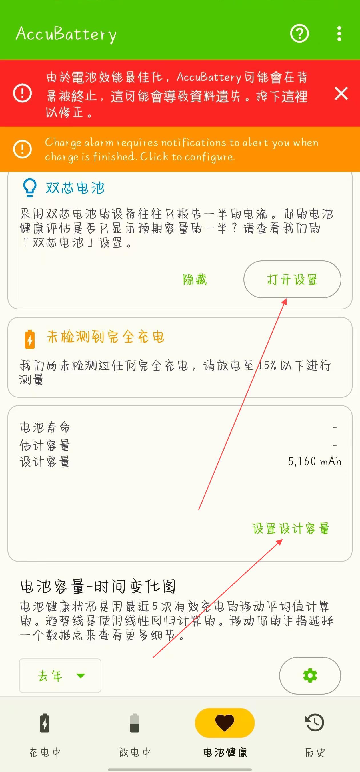 2、若設(shè)備是雙芯電池,點(diǎn)擊雙芯電池區(qū)域的打開設(shè)置,可進(jìn)入對(duì)應(yīng)設(shè)置頁,輔助更準(zhǔn)確評(píng)估電池健康;還能點(diǎn)擊設(shè)置設(shè)計(jì)容量,按需修改電池設(shè)計(jì)容量數(shù)值。