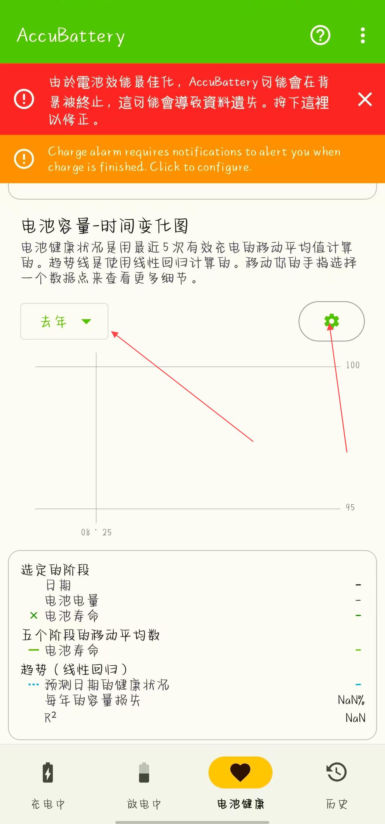 3、在電池容量-時(shí)間變化圖部分,點(diǎn)擊時(shí)間篩選框可選擇不同時(shí)間范圍,點(diǎn)擊右側(cè)齒輪圖標(biāo)進(jìn)入設(shè)置,查看電池健康隨時(shí)間變化情況,了解電池壽命趨勢(shì)。