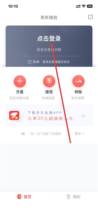 1、打開京東錢包app,點(diǎn)擊首頁上方的點(diǎn)擊登錄按鈕。