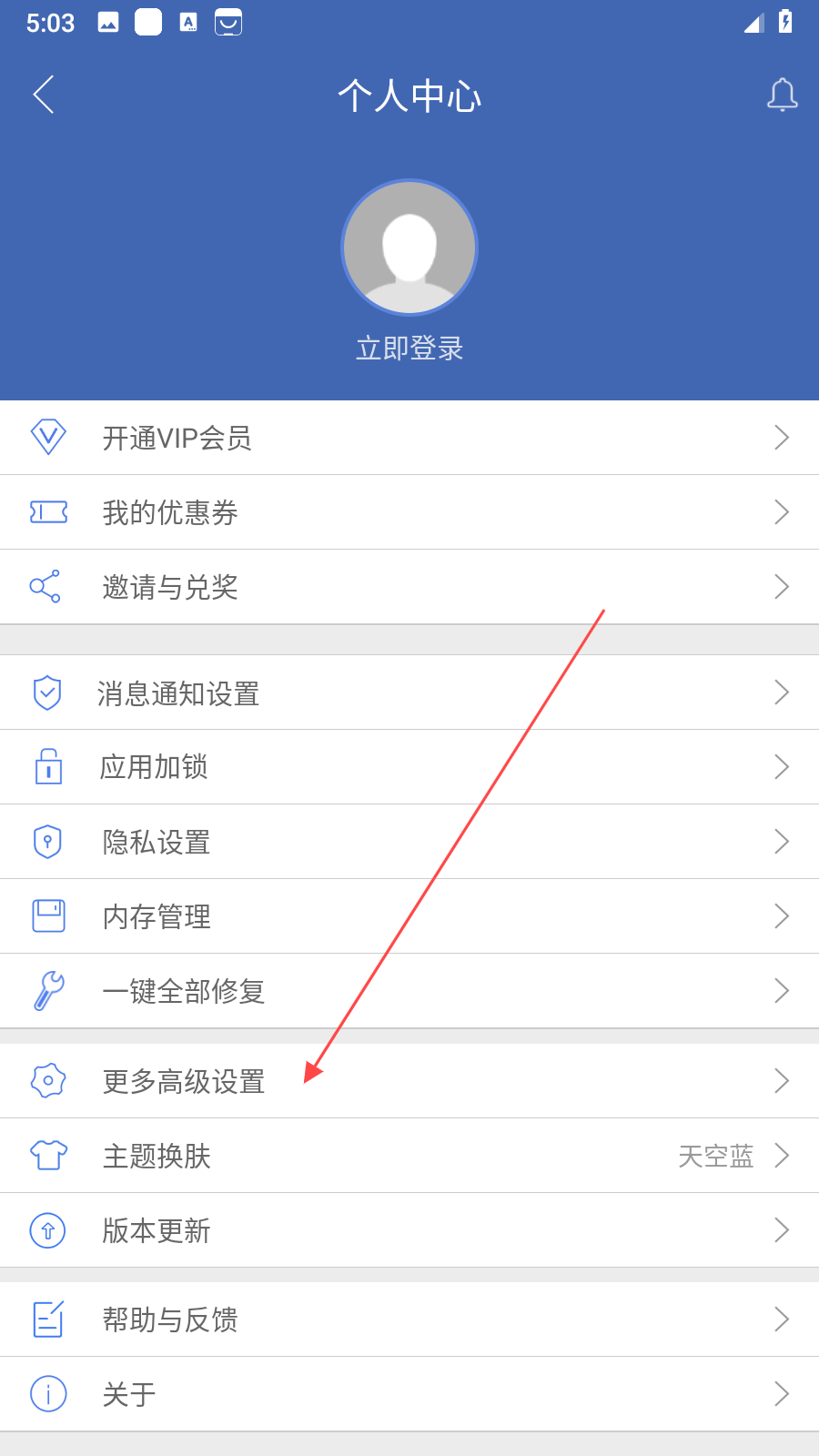 1、打開雙開助手微分身版應(yīng)用,點(diǎn)擊左上角的頭像圖標(biāo)進(jìn)入個(gè)人中心頁面,在眾多選項(xiàng)中找到更多高級設(shè)置選項(xiàng)并點(diǎn)擊進(jìn)入。